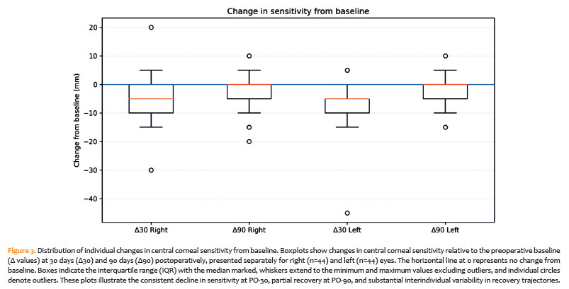 RESULTS: Corneal sensitivity decreased after surgery. In right eyes, mean sensitivity declined from 41.14 ± 7.77 mm at baseline to 36.82 ± 9.03 mm at 30 days and partially recovered to 38.64 ± 7.73 mm at 90 days. In left eyes, sensitivity decreased from 44.11 ± 6.29 mm to 37.39 ± 9.05 mm at 30 days and recovered to 41.82 ± 7.63 mm at 90 days. Left eyes showed higher sensitivity than right eyes at baseline (p=0.023) and at 90 days (p=0.018). At 90 days, complete or near-complete recovery (within ± 5 mm of baseline) occurred in 73.2% of right eyes and 78.0% of left eyes, while improvement above baseline (≥ +5 mm) occurred in 7.3% and 4.9%, respectively. Age showed weak, nonsignificant correlations with Δ90 (p=−0.14 to −0.19; p>0.2).