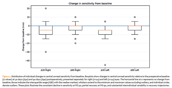 An inter-eye asymmetry in sensitivity was observed, with left eyes exhibiting higher sensitivity than right eyes at both baseline and 90 days. While speculative, this difference may reflect anatomical variations in innervation, ocular dominance, or differential postoperative inflammatory responses(12,14,16). The absence of significant asymmetry at 30 days suggests similar acute injury, with divergence over time reflecting individual recovery trajectories(13,17). Other contributing factors may include surgeon ergonomics and handedness, as well as contralateral neuroimmune modulation reported after unilateral corneal insult(30).