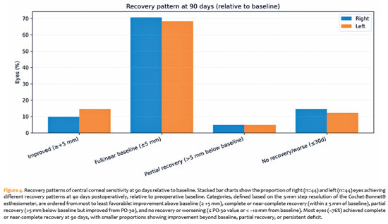 Recovery patterns at 90 days relative to baseline are summarized in table 4 and figure 4. Using categories aligned with the 5-mm resolution of the Cochet-Bonnet® esthesiometer, the majority of eyes achieved complete or near-complete recovery (within ± 5 mm of baseline): 73.2% of right eyes and 78.0% of left eyes. Improvement above baseline (≥ +5 mm) occurred in 7.3% of right eyes and 4.9% of left eyes. Partial recovery (>5 mm below baseline) was observed in 12.2% of eyes in both groups, whereas no recovery or worsening was noted in 7.3% of right eyes and 4.9% of left eyes.
