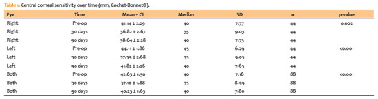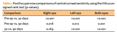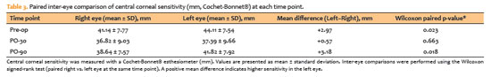 When both eyes were analyzed together, mean sensitivity declined from 42.63 ± 7.18 mm preoperatively to 37.10 ± 8.99 mm at PO-30 and partially recovered to 40.23 ± 7.80 mm at PO-90, with all pairwise comparisons statistically significant (Table 2).