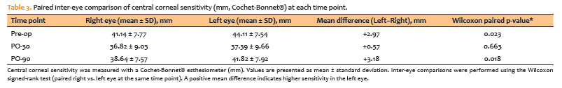Paired inter-eye comparisons (Table 3) indicated that left eyes had higher sensitivity than right eyes at baseline (mean difference +2.97 mm, p=0.023) and at PO-90 (mean difference +3.18 mm, p=0.018). In contrast, no significant difference was observed at PO-30 (mean difference +0.57 mm, p=0.663).