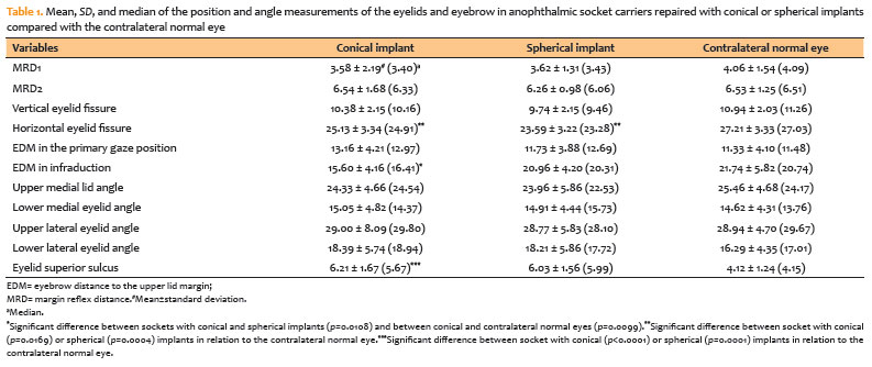 To the best of our knowledge, this is the first study to quantitatively evaluate eyebrow and eyelid positions in patients with unilateral anophthalmic sockets reconstructed with conical versus spherical implants. Although spherical implants are widely used,(5) some authors have suggested that conical implants provide superior eyelid support and improved eyelid positioning6. The findings of the present study do not support this hypothesis.