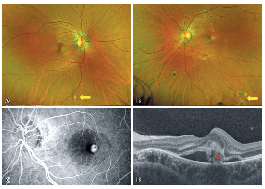 A 25-year-old woman presented with decreased visual acuity in her left eye (20/40). Fundoscopic examination (Figure 1A, 1B), fluorescein angiography (Figure 1C), and optical coherence tomography (Figure 1D) demonstrated findings consistent with presumed ocular histoplasmosis syndrome, a condition typically reported in endemic regions of the United States. The characteristic triad—peripapillary atrophy, multiple "histo spots" (yellow arrows), and a choroidal neovascular membrane (red asterisk)—was identified in the absence of intraocular inflammation or systemic manifestations. These findings supported the diagnosis of presumed ocular histoplasmosis syndrome despite the nonendemic geographic setting. This case represents a rare phenocopy of presumed ocular histoplasmosis syndrome in Brazil(1,2).