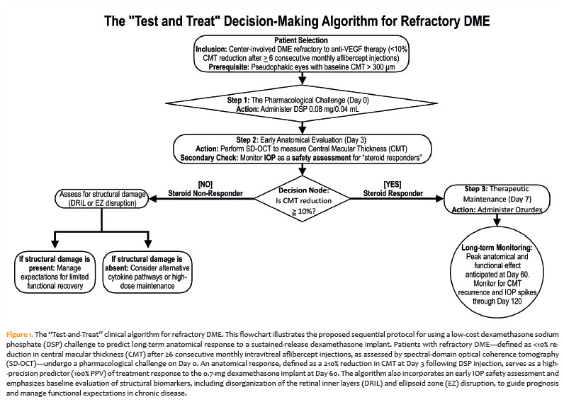 In conclusion, this study provides initial evidence that a short-term intravitreal challenge with DSP is a safe, accessible, and highly promising predictor of anatomical response to dexamethasone implantation in refractory DME. Based on these findings, we propose a clinical decision-making algorithm to optimize the management of refractory DME in resource-limited settings (Figure 1). This "test-and-treat" approach employs the DSP challenge as a diagnostic tool for both efficacy and safety before commitment to high-cost sustained-release therapy.