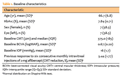 Twelve eyes from 12 participants completed the study protocol. Baseline characteristics were consistent with a population exhibiting advanced, chronic diabetic macular edema (Table 1).