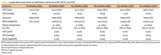 The sequential corticosteroid regimen resulted in rapid and sustained anatomical improvement. Following the single 0.08 mg DSP injection, median CMT decreased significantly from 375.0 μm at baseline to 354.0 μm on Day 3 (p=0.002). After dexamethasone implant administration on Day 7, further macular drying was observed, with median CMT decreasing to 341.0 μm on Day 30 (p=0.002) and reaching a nadir of 305.0 μm on Day 60 (p=0.002). A mild trend toward recurrence was noted by Month 4, consistent with the known pharmacokinetics of the dexamethasone implant.