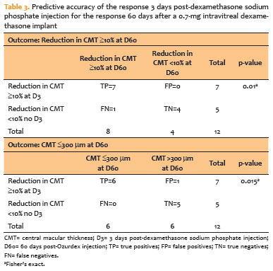 Similarly, a ≥10% reduction in CMT at Day 3 strongly predicted the achievement of a clinically "dry" macula (CMT ≤300 μm) at Day 60 (Ozurdex effect). In this analysis, sensitivity was 100% (95% CI, 60-100), specificity was 83.3% (95% CI, 45-97), PPV was 86% (95% CI, 54-97), and NPV was 100% (95% CI, 57-100; Table 3).