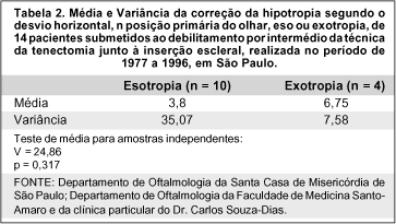 A pequena magnitude da amostra prende-se ao fato da raridade dos casos em que se opera apenas um dos músculos OS com a intenção de corrigir a HoT. A técnica da tenectomia foi escolhida para este estudo, por ser uma das mais realizadas na prática dos serviços de onde os pacientes são provenientes, oferecendo, assim, amostra suficiente para análise estatística.
