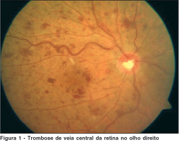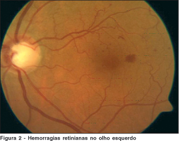 Após dois meses, a paciente procurou atendimento queixando-se da diminuição súbita da acuidade visual no olho direito. O exame de acuidade visual apresentou movimentos de mãos e o exame fundoscópico constatou hemorragia vítrea. Com a absorção da hemorragia vítrea, quinze dias depois foi possível o exame da retina e constatar a forma não isquêmica de trombose da veia central. Três semanas após a baixa visual no olho direito, foram observadas, no olho contralateral, hemorragias retinianas profundas na arcada temporal superior (Figuras 1 e 2).
