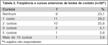 A tabela 2 mostra a freqüência anterior a cursos de lentes de contato. Referiram somente um curso 28,2%; dois cursos 25,6%; três cursos 5,1%; cinco cursos 2,6% e mais de 10 cursos 2,6%. 23,1% nunca freqüentaram cursos de lentes de contato e 12,8% não responderam.