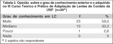 Na Faculdade de Medicina da Universidade de São Paulo, o setor de lentes de contato foi inaugurado há três anos (2002) com a finalidade de ensinar a adaptação de lentes de contato. Ademais, cursos de imersão passaram a ser oferecidos a todos os que desejassem ampliar seus conhecimentos. Comparando o conhecimento anterior com o adquirido no "III Curso Teórico e Prático de Adaptação de Lentes de Contato da USP", 59,0% referiram ter acrescentado muito conhecimento e 33,3% conhecimento mediano. Nenhum sujeito referiu nada ter sido acrescentado (Tabela 3).