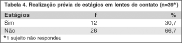 Lembrando que, apesar de 66,7% responderem que não se submeteram a estágios em lentes de contato (Tabela 4), não se pode deduzir que seja conduta generalizada, pois a amostra não é probabilística e compõe-se de oftalmologistas interessados em aperfeiçoamento em lentes de contato.