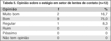 A tabela 4 apresenta se o aluno já se submeteu a estágios em lentes de contato; 66,7% responderam que não; 30,7% responderam que sim; e 2,6% não responderam. Em relação à realização do estágio, 75,0% declararam ter sido bom; 16,7% muito bom; e 8,3% regular (Tabela 5).