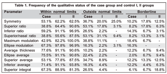 Status denominators (within normal limits, borderline and outside normal limits) were obtained and analyzed, calculating the frequency of the data obtained for each GDx® parameter in DUSN eyes. A comparison was established between the qualitative and quantitative frequencies in the three groups (diseased, control I and control II). The quantitative frequencies were provided by the following parameters: symmetry, superior ratio, inferior ratio, superior/nasal, max. modulation, the number, average thickness, ellipse average, superior average and superior integral. Some patients underwent more than one examination at different time intervals, but only the first examination with reproductibility and software approval was considered.