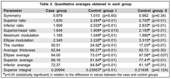 Table 2 presents averages obtained for each parameter in the 3 groups. It was observed that the mean of these values was greater in the control groups compared to the DUSN group. A statistically significant difference was found in practically all the parameters assessed (p<0.05), except for symmetry, average thickness and superior integral when comparing control group II and the DUSN group.