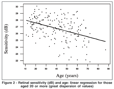 CONCLUSIONS: Correlation between retinal sensitivity values and age based on the autoperimeter Octopus 201 (average sensitivity of 31.2 – 0.064 x age) is different from that found in this study: average sensitivity of 28.4 – 0.040 x (age) for the whole sample; 28.7 – 0.050 x (age) for subjects aged 20 or more. Values obtained with the Octopus 1-2-3 autoperimeter cannot be compared with those by other Octopus models (101, 201 and 500) due to their distinct features.