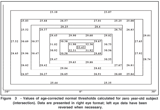 2) values of retinal sensitivity and its correction according to the age used in Octopus autoperimeters (average sensitivity = 31.2 – 0.064 x (age) are different from those found here: