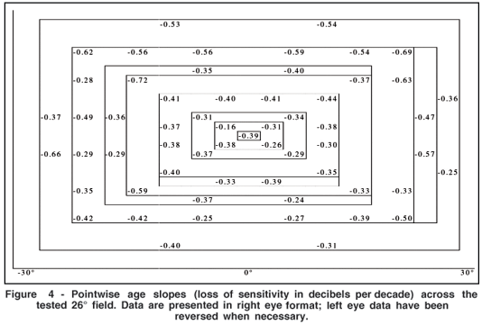 Reduction of average visual sensitivity at the central point in relation to the reduction of average sensitivity of more peripheral points, for both groups, was 7.83 dB, i.e., -0.30 dB/degree of eccentricity.