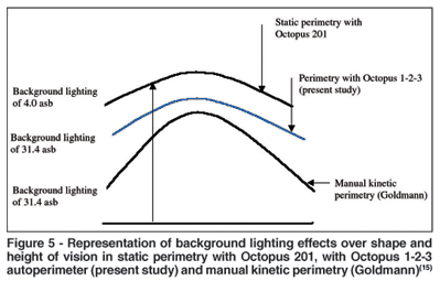 However, in the present study, a single and parallel visual island with a lower height (Figure 5) was observed considering that similar values have been found(2,4) when the correlation between sensitivity reduction and eccentricity was studied.