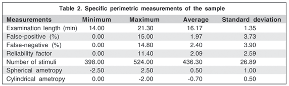 Subjects were from 11 to 87 years old, with average equal to 40 and standard deviation, 17.3. Specific measurements of examination (minimum, maximum, average and standard deviation values) and the respective parameters of confidence (examination length, false-positive and false-negative responses, number of applied stimuli and spherical and cylindrical ametropies) are shown in table 2.