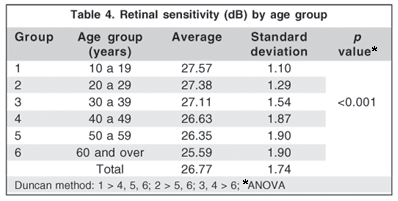 For data analysis, the central limit theorem was used. Here, in only two age groups the number of subjects was less than 30 (groups 1 and 3 with 28 subjects). There were 30 or more patients in the other age groups and, therefore, the number of subjects was regarded to be statistically adequate. To assess visual sensitivity averages, Student's t test was used to compare averages between two age groups and variance analysis for three or more groups. When p showed to be lower than 0.05, one could conclude with 95% confidence that at least one of the groups showed an average value different from the others. Identification of different groups was carried out by means of Duncan's method of multiple comparisons. Pearson correlation (r) coefficient was used to evaluate the ratio between age and visual sensitivity. Linear regression was used to find the equation that would better represent the variables correlation under study. Determination coefficient (R²), in the present study, was a visual sensitivity variation value supported by the regression line, in this case, by the subject's age. The U test (non-parametric) was used in order to compare average sensitivity reduction with age in the central and paracentral regions.