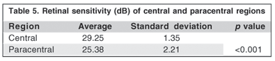 Average and standard deviation of mean sensitivity (MS) in both phases, in the 59 tested points with normal strategy, were: 26.77 dB ± 1.74 dB, minimum 21.8 dB and maximum 30.10 dB. Average and standard deviation of MS in the first and second phases were 27.15 ± 1.65 dB and 26.39 ± 1.93 dB, respectively (Table 3). Differences between average values was statistically significant (p<0.001).