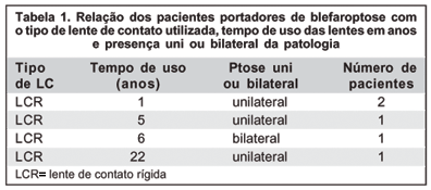 A freqüência de ocorrência de ptose no grupo estudado foi de cerca de 10% (5 pacientes). O estudo incluiu pacientes usuários de lentes de contato rígidas e gelatinosas e com diferentes períodos de uso de lentes de contato, o que justifica a freqüência inferior de ptose, se comparada com outras pesquisas, como quando foram examinados usuários de lentes de contato rígidas por período acima de 10 anos, tendo sido observado blefaroptose em 25% dos indivíduos, com a margem palpebral 0,5 mm mais baixa que a dos controles(8).