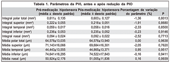 A tabela 1 revela que não houve diferença estatisticamente significativa entre os parâmetros do PVL medidos antes e após a administração de medicação ocular hipotensora (p>0,05).