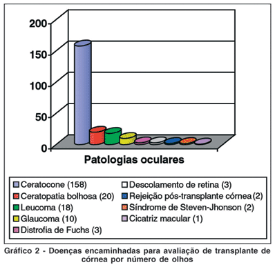 Muitos pacientes encaminhados para transplante em nosso serviço não apresentavam indicação para o mesmo, fato que demonstra o desconhecimento dos oftalmologistas gerais sobre as indicações reais do transplante de córnea. Quanto às principais doenças indicadas para transplante o ceratocone predominou, seguido da bolhosa do pseudofácico.