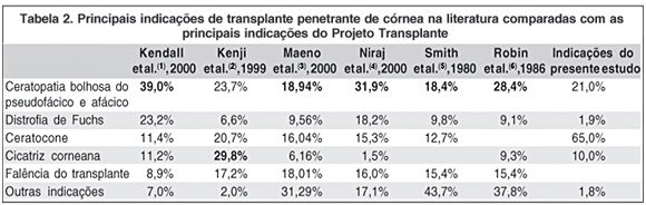 As principais indicações de transplante penetrante de córnea da literatura internacional comparada às indicações feitas em nosso ambulatório, constam na tabela 2.