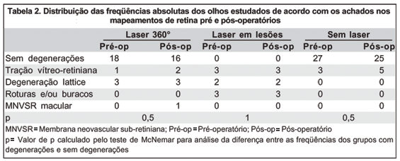 Os achados dos mapeamentos de retina pré e pós-operatório dos grupos estão resumidos na tabela 2.