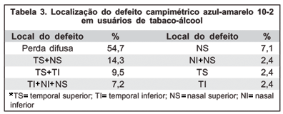 A perimetria de ondas curtas (azul-amarelo), capaz de identificar alterações funcionais três a cinco anos antes da perimetria convencional(7), tem sido útil para detecção precoce de diversas entidades nosológicas, inclusive algumas desordens neuro-oftalmológicas(8), mas em diversos trabalhos foram usadas amostras de usuários de tabaco-álcool em processo de reabilitação.