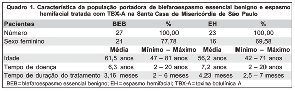 Foram analisados 50 prontuários de pacientes com BEB e EH, submetidos à terapia com TBX-A, no período de abril de 2002 a maio de 2004 no setor de Óculo-Plástica da Santa Casa de Misericórdia de São Paulo (SCMSP). Dos 50 pacientes, 27 apresentavam BEB e 23 EH. Foi aplicado o questionário complementar que indagava sobre grau de satisfação após a aplicação da TBX-A, custos pessoais e gastos com transporte, alimentação e perda de dia de trabalho.