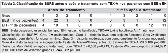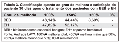 A melhora dos sintomas do BEB e do EH é evidente após o tratamento com a TBX-A. Na tabela 3, nota-se um elevado grau de satisfação dos pacientes após um mês de tratamento. A aplicação ambulatorial da TBX-A é um tratamento eficaz no controle temporário do BEB e EH, e uma boa alternativa ao tratamento cirúrgico.