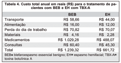 A tabela 1, que analisa os gastos com materiais e medicamentos, mostra que os custos são maiores para os pacientes com BEB. Isso se deve provavelmente à duração do efeito da TXB-A nesses pacientes (cerca de três meses). Nos pacientes portadores de EH o efeito persiste por quatro a seis meses(1).