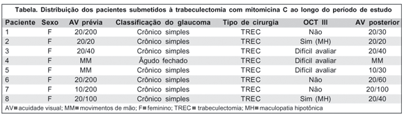 Foram estudados oito olhos de pacientes submetidos à trabeculectomia com mitomicina C que realizaram OCT III (Tabela). Todos do sexo feminino com idade entre 35 e 75 anos.
