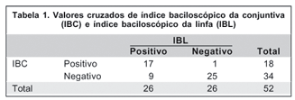Pode-se demonstrar que a baciloscopia de conjuntiva apresenta uma sensibilidade de 65,4%, especificidade de 96,2%, valor preditivo positivo de 94,4% e o valor preditivo negativo de 73,5% (Tabela 2). Não foi possível comparar este resultado com outras pesquisas porque não foi encontrado, na literatura pesquisada, qualquer trabalho que avaliasse a baciloscopia de conjuntiva como teste diagnóstico exclusivamente em pacientes virgens de tratamento específico para hanseníase.
