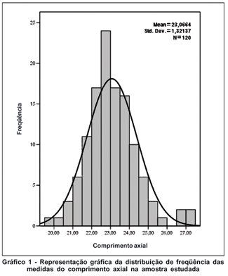 O comprimento axial ocular médio dos 120 exames ultra-sônicos foi de 23,06 mm (Gráfico 1). A média dos valores do comprimento axial obtidos com a técnica de imersão foi de 23,19 mm e de 22,93 mm com a técnica de contato, sendo que curva de distribuição normal encontra-se no gráfico 2. Foi constatada correlação muito forte 0,974 pelo Coeficiente de Correlação de Pearson e a diferença de 0,255 mm entre os dois métodos mostrou significância de 0,01 pelo teste t de amostras pareadas.