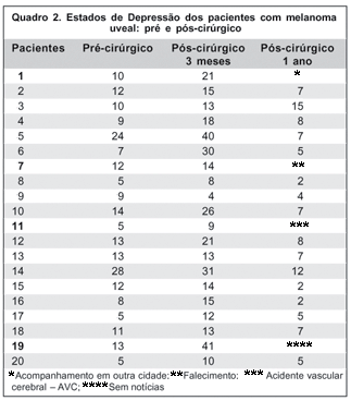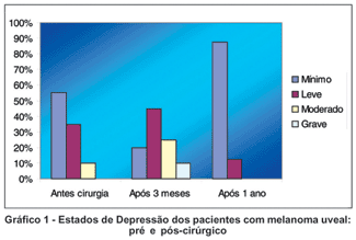 PURPOSE: To evaluate prospectively the emotional repercussions in the individual with uveal melanoma and surgical indication in three phases: diagnosis and preoperative, postsurgery and late postsurgery. METHODS: Clinical qualitative study based on the following instruments: STAI - State, Trait Anxiety Inventory; BDI - Beck Depression Inventory; Quality of Life Questionaire SF-36. RESULTS: The sample of this study consisted of 20 patients, 13 males and seven females, with average age of 52 years. Before surgery: the patients appear fragile and impacted by diagnosis and treatment. The state of depression indicates a minimum to light state. Anxiety has the state increased in relationship to Trait. Quality of Life has the emotional and physical aspects affected. Three months after surgery: the Depression shows to light to serious state. Anxiety has the state considerably increased. Quality of Life has most aspects affected: the physical, vitality, social, mental health and emotional aspects being the most affected. One year after surgery: the State of Anxiety decreases considerable. The Trait of Anxiety is maintained in most patients when compared to the first evaluation. Depression shows a minimum state. Quality of Life has most of its aspects balanced. CONCLUSION: After three months of surgery the patients appear more fragile with adaptation difficulty, Anxiety and Depression increasing. This period revealed to be the worst moment. One year after surgery, they appear more structured and with a more balanced Quality of Life.