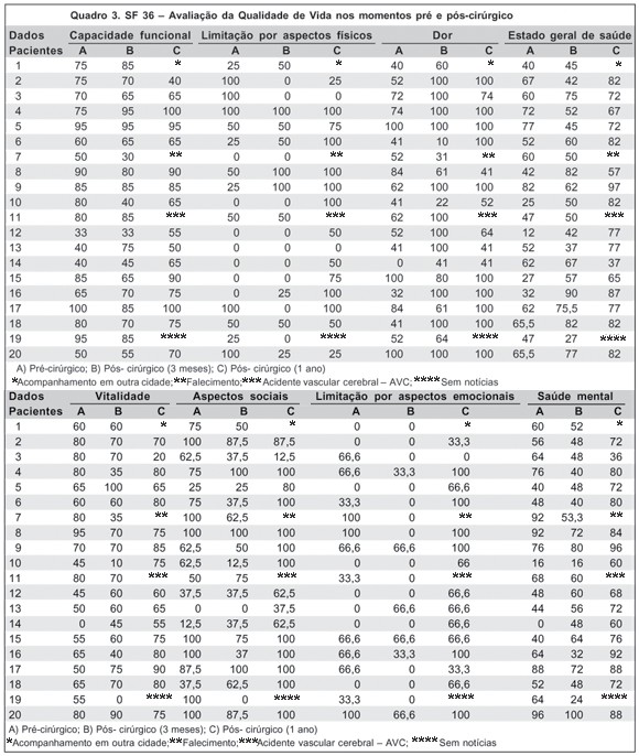 A avaliação da Qualidade de vida foi feita por meio do instrumento SF-36 que considera 0 o pior valor e 100 o melhor valor esperado na pontuação da avaliação.