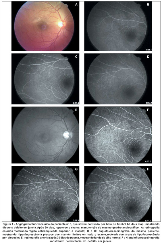 Foi realizada angiografia fluoresceínica em 10 pacientes no primeiro exame, e repetida em 3 pacientes cerca de 30 dias após o trauma.
