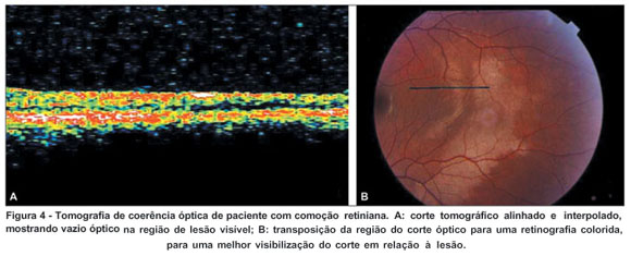 Outros dois pacientes apresentaram apenas comoção retiniana. Nos cortes feitos na transição entre a retina de aspecto normal e a retina de aspecto esbranquiçado, percebe-se uma diminuição progressiva da refletividade em direção à retina afetada (Figura 4).