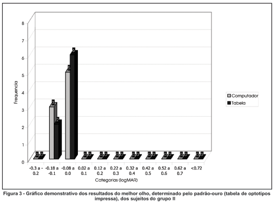 Comparando os resultados do grupo II determinados através da tabela impressa de optotipos e do programa computadorizado (Figura 3), podemos dizer que para a avaliação dos sujeitos desse grupo os dois métodos foram equivalentes e, por isso, não foi possível realizar análise estatística dos resultados dos olhos normais.