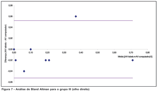 A mesma tendência do teste computadorizado em superestimar os valores da AV foi encontrada quando analisamos os 10 olhos direitos e os 10 olhos esquerdos dos sujeitos do grupo III, através do computador e da tabela impressa. O teste t-pareado não mostrou diferença estatisticamente significante (em média) entre os testes (p=0,496 logMAR para o olho direito e p=0,210 logMAR para o olho esquerdo) talvez devido ao tamanho reduzido da amostra que compunha o grupo III.