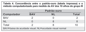 No grupo III, encontramos 8 olhos com AV normal e 2 olhos com baixa de AV pelo padrão-ouro, e pela comparação dos resultados, o teste computadorizado apresentou sensibilidade e especificidade de 100% (Tabela 4).