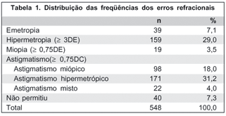 A distribuição das freqüências dos pacientes (274 pacientes = 548 olhos) quanto à refração, realizada sob cicloplegia, encontra-se na tabela 1. Não foi possível realizar o exame em 20 pacientes 40 olhos (7,3%).