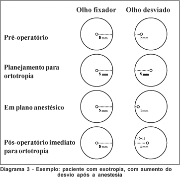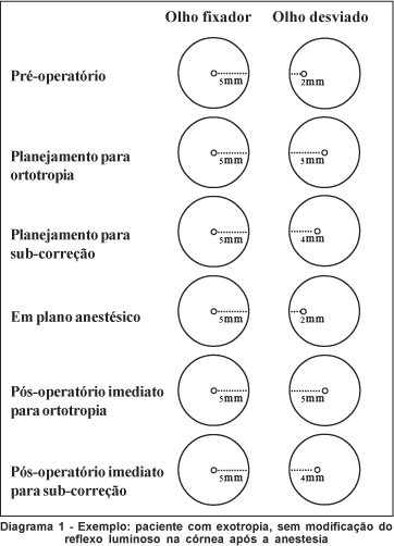 a) Não haver modificação do desvio em plano anestésico. Nessa situação, se o planejamento é para ortotropia, por exemplo, ao final da cirurgia, a medida do reflexo no olho anteriormente desviado deve estar na mesma distância do limbo que no olho fixador (Diagrama 1).