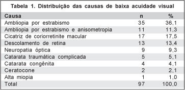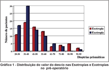 Dos 153 pacientes operados, 73 (47,8%) tinham ET e 80 (52,2%) tinham XT. As ET foram subdivididas em congênita (27,4%), infantil, ou seja, de aparecimento até 1 ano de idade (19,2%) e adquirida (53,4%). Dos pacientes com XT, 25 (31,2%) tinham diagnóstico de estrabismo sensorial (secundário à baixa visão, excluindo ambliopia). As causas de baixa acuidade visual estão representadas na tabela 1. A distribuição dos valores do desvio pré-operatório é mostrada no gráfico 1.