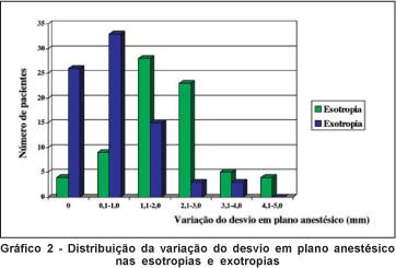 Após a anestesia, houve alteração do desvio em 123 (80,4%) pacientes: 69 (56,1%) eram ET que diminuíram, 51 (41,5%) eram XT que aumentaram e 3 (2,4%) eram XT que diminuíram. Nos 3 pacientes em que houve diminuição da XT, a variação do desvio foi de 1mm. Houve associação estatisticamente significante entre o tipo de desvio e sua variação após a anestesia, sendo mais evidente nas ET (p=0,005) (Tabela 2). O gráfico 2 mostra a distribuição da variação do desvio em plano anestésico.