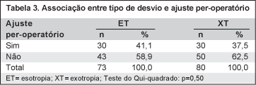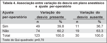 Foi realizado o ajuste per-operatório em 60 (39,2%) casos. Não houve associação estatisticamente significante nem entre o tipo de desvio e a necessidade de ajuste (p=0,50) (Tabela 3) e nem entre a presença de variação do desvio após a anestesia e a necessidade de ajuste (p=0,70) (Tabela 4). Por outro lado, houve associação estatisticamente significante entre o valor do desvio pré-operatório e a necessidade de ajuste, que foi mais freqüente nos desvios maiores (p=0,05) (Tabela 5).